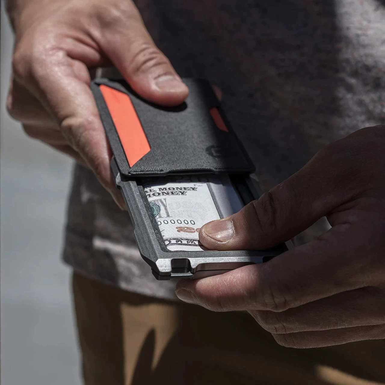 The chassis of the Dango A10 Adapt Single Pocket Wallet is made of machined 6061 aerospace grade aluminium and anodized to perfection. The A10 is equipped with Dango’s popular and unique patent pending quick release rail mechanism on both sides of the wallet that allows easy access to cards while keeping them securely in place. On one side of the chassis is a horizontal cavity holding up to 4 cards that is protected by a removable aluminium RFID plate. On the other side is a single card, vertical oriented cavity meant for displaying identification, badges and any cards that needs scanning; perfect for accessing secured buildings and boarding public transportation.