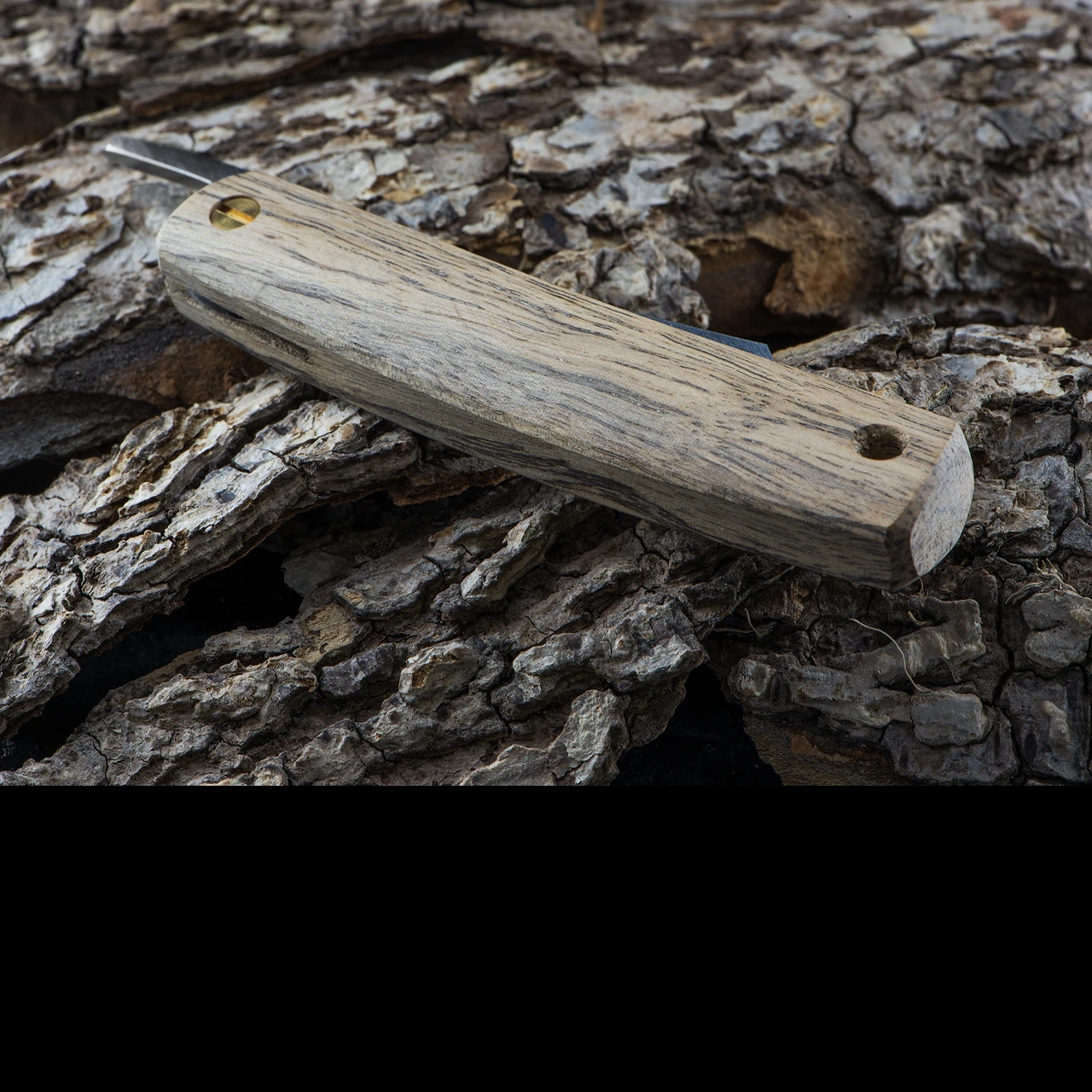 The handle is simply one piece of Black Persimmon wood with the mid section precisely cut out to accommodate the blade. The blade is made from tough, hard carbon steel and has an extended tang to aid one handed opening and to prevent closing during use.