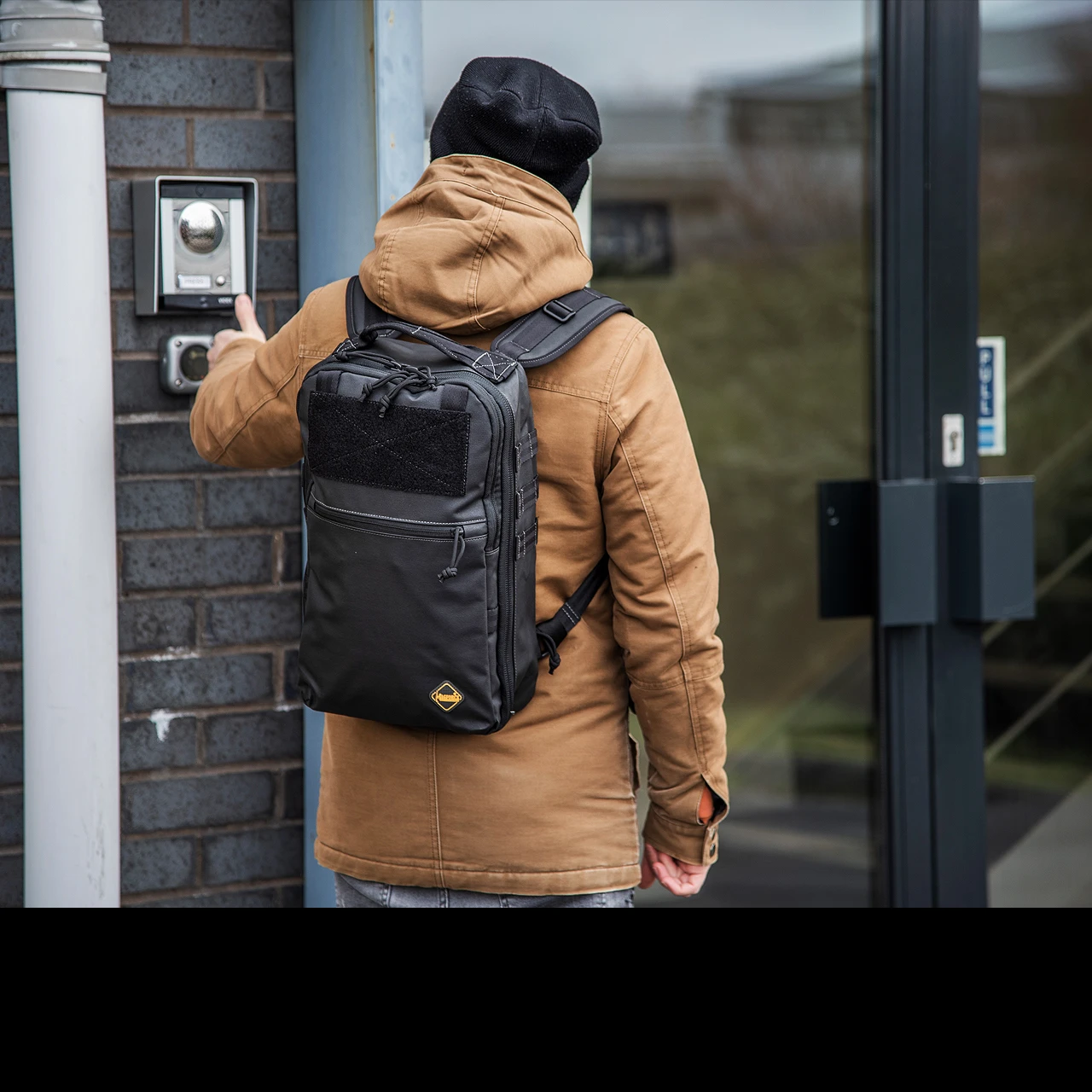 The 500 Denier material is waterproof and extremely tough. The slimline but roomy interior is perfectly suited to books, folders and a laptop/iPad (the rear section is padded to protect fragile items). The main compartment features a zippered web pocket, a section to add pouches and pockets and a large sleeve for you iPad. The front section has one large surface for added modular pockets and loops and opens flat to access your EDC items. There is also a front zippered pocket for keys, wallet and vital documents.