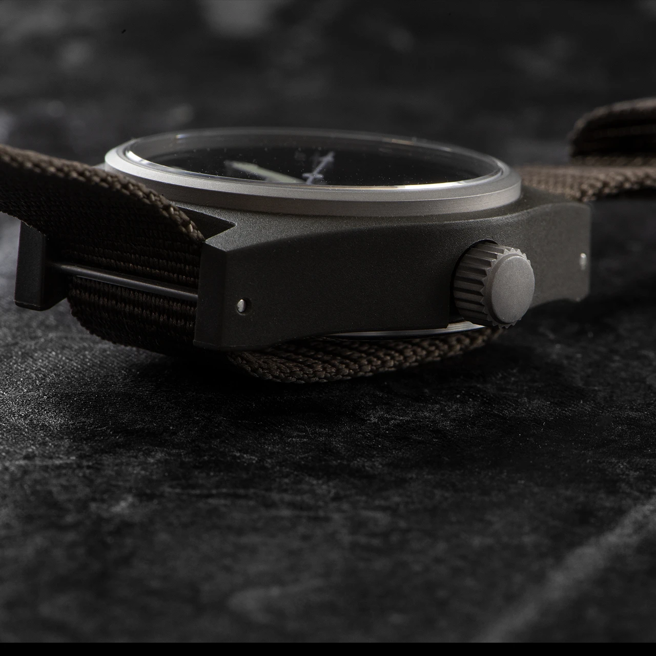 This updated version now features a sapphire crystal lens and still made from a highly durable, impact resistant fibershell case that is water resistant to 3 atmospheres (30 meters – 100 feet), sweat resistant and will not yield to the elements. The fibershell case of the Marathon GPQ also has a passive matte finish which aids in protecting infantry positions as this finish does not provide a reflective surface which would occur on a normal metal case. Fibershell is also an extremely lightweight material, an important factor on the battlefield where every ounce counts.
