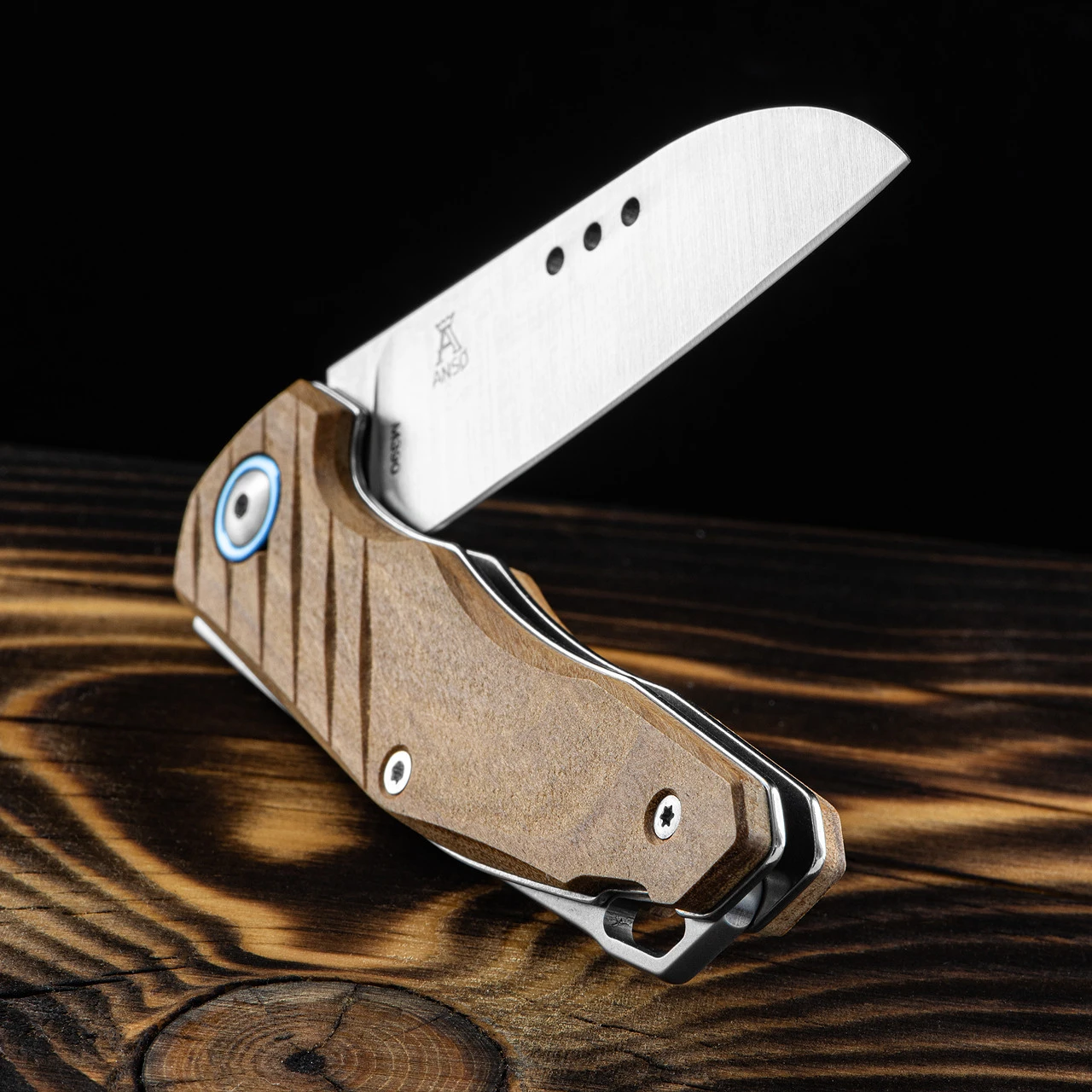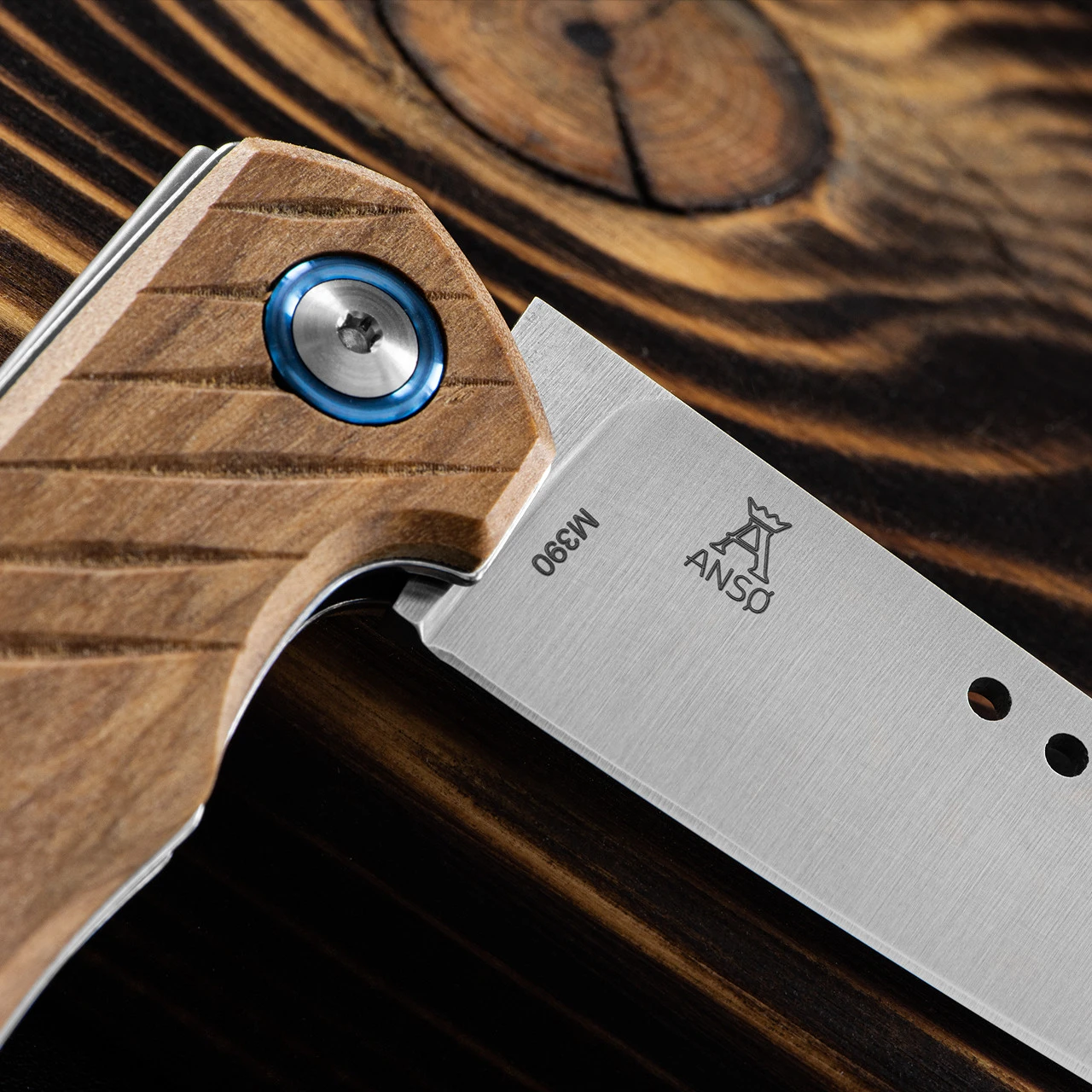 The blade of the MKM Root Wood is M390 stainless steel which is a powder steel with unbelievable strength and edge resistance, often referred to as a “super steel.”