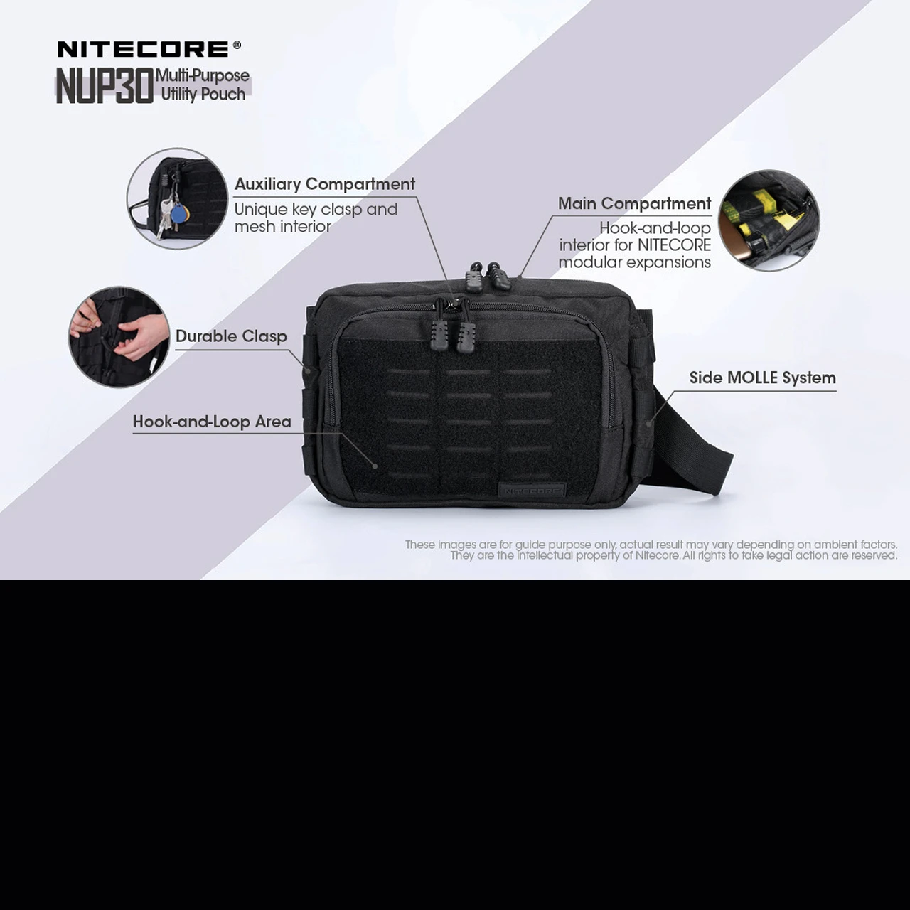 The Nitecore NUP30 is low profile utility pouch which can be used either independently or for modular expansion to a larger bag, such as the Nitecore BP25 backpack. It is made from black 600D polyester fabric with a dirt and water resistant coating.