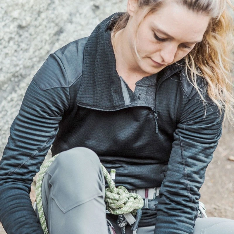 Storm’s statuesque, asymetric ¼-zip funnel collar brings dramatic warmth when needed, or zips down for maximum ventilation when things heat up. The low profile kangaroo pocket keeps your fingers warm in between belays or around the campfire, and thumb-hole cuffs provide extra warmth and security for active pursuits.